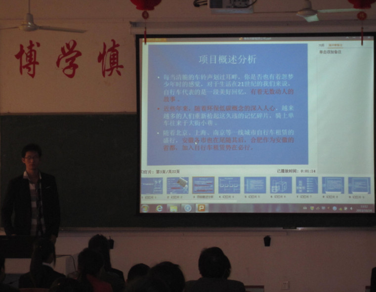 总决赛分创业和就业两组进行。首先创业组7位选手展示了他们创业的周密规划和美好的前景,并现场回答了评委的提问;接着就业组5位选手展示了他们的人生规划。经过激烈角逐,朱长银团队的自行车租赁项目以优异的实战经验和良好的经营业绩,获得本次大赛的创业组金奖,程龙同学以优美的PPT展示了完善的职业生涯规划,也由此获得本次大赛的就业组金奖。本次大赛共设置了一、二、三等奖。大赛历时一个月,首先是辅导员以班会的形式在班级进行全面宣传和动员,通过班级海选,最终每个辅导员选送1组选手,另加第三届职业规划大赛的前三名选手,共有12组选手进入了总决赛。
