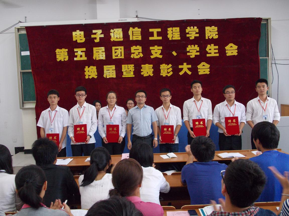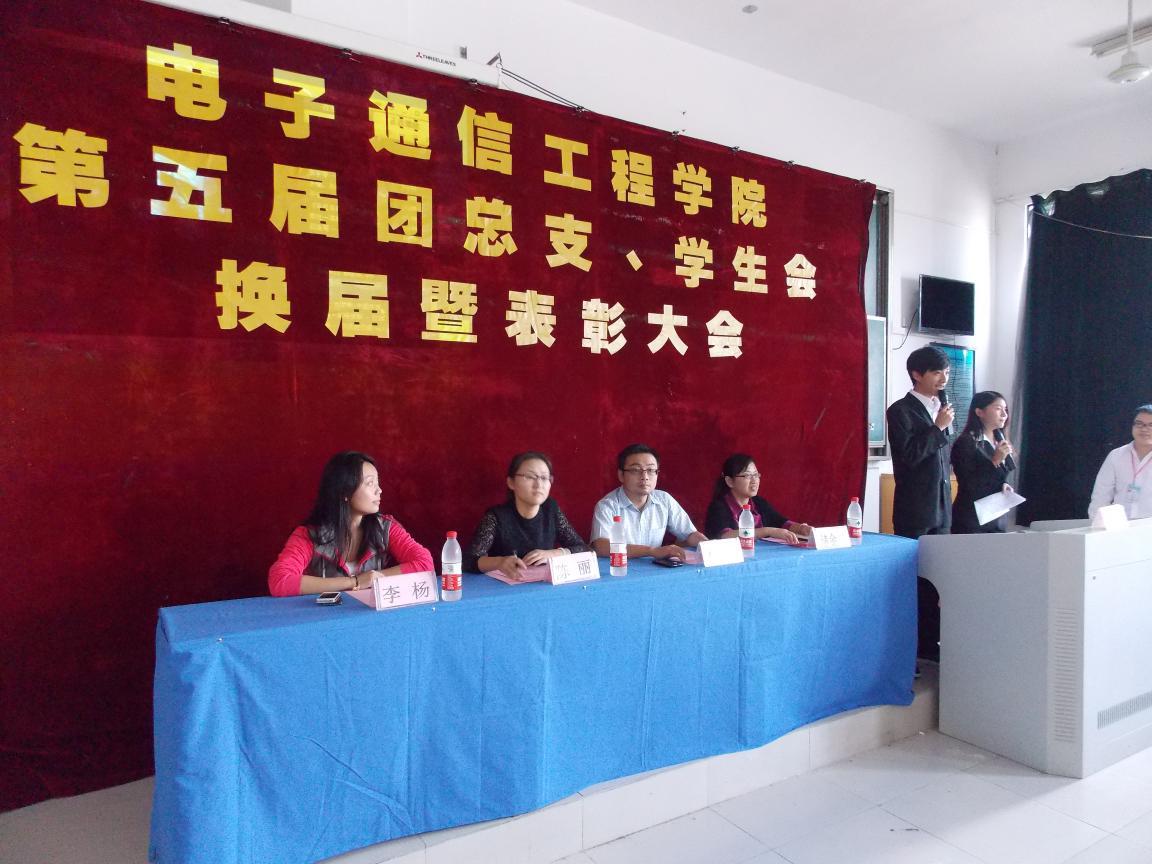 (图、文/电院记者团 审核/陈丽)10月11日中午在公教201,电子通信工程学院如期开展了第五届团总支学生会换届暨表彰大会。出席本次会议的有电子通信工程学院副院长操宏华、团总支书记陈丽、行政秘书储金华、辅导员代表李扬以及学生会全体成员。