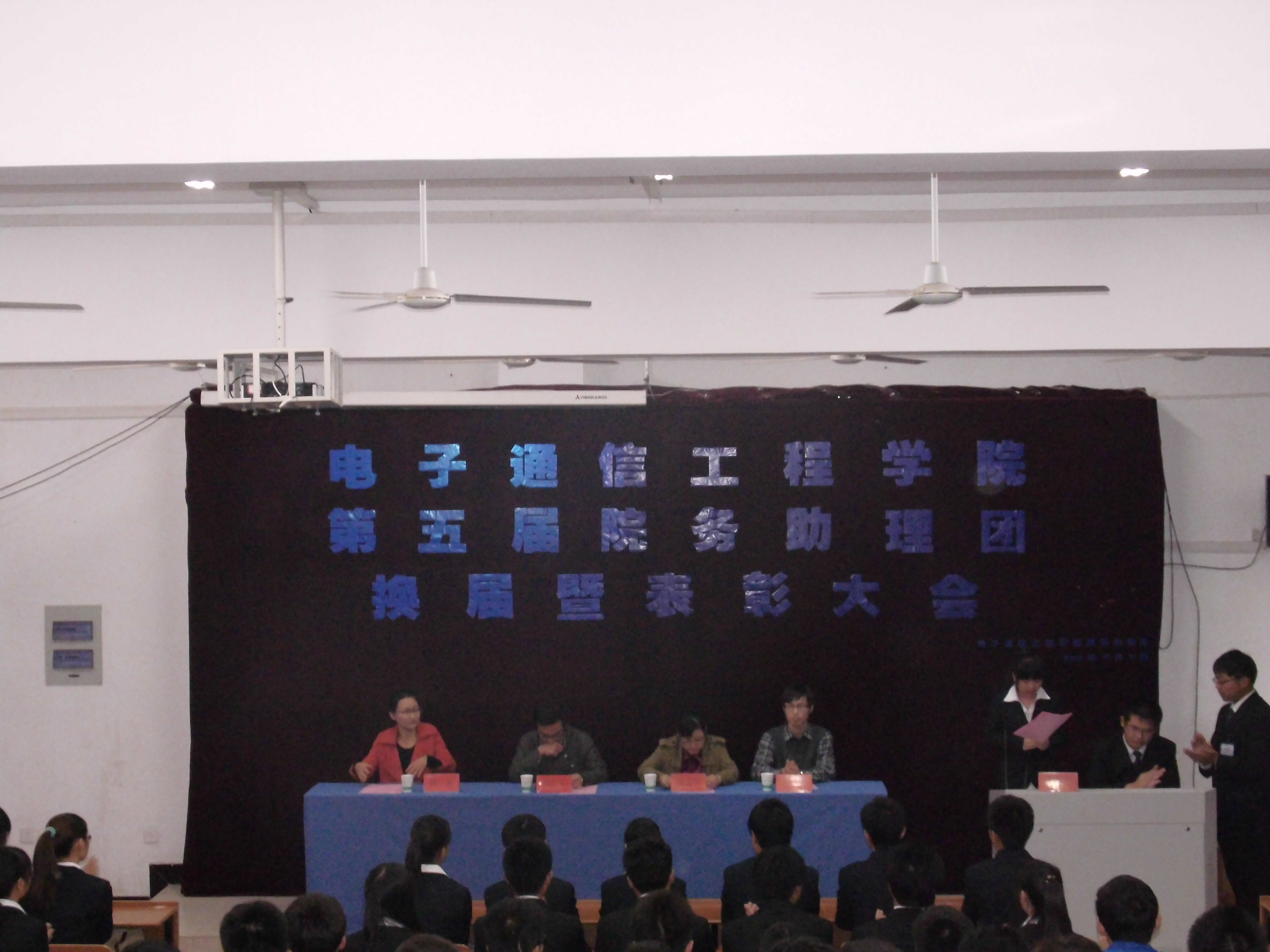 2013年10月31日,电子通信工程学院院务助理团换届暨表彰大会在教学楼12号楼201教室隆重举行。莅临本次大会的领导及老师有电子通信工程学院行政副院长操宏华,行政秘书、助理团指导老师储金华,学管秘书陈丽,实验室主管王志。此外,各兄弟院系及社团同仁代表、各班级代表也应邀参加了本次大会。