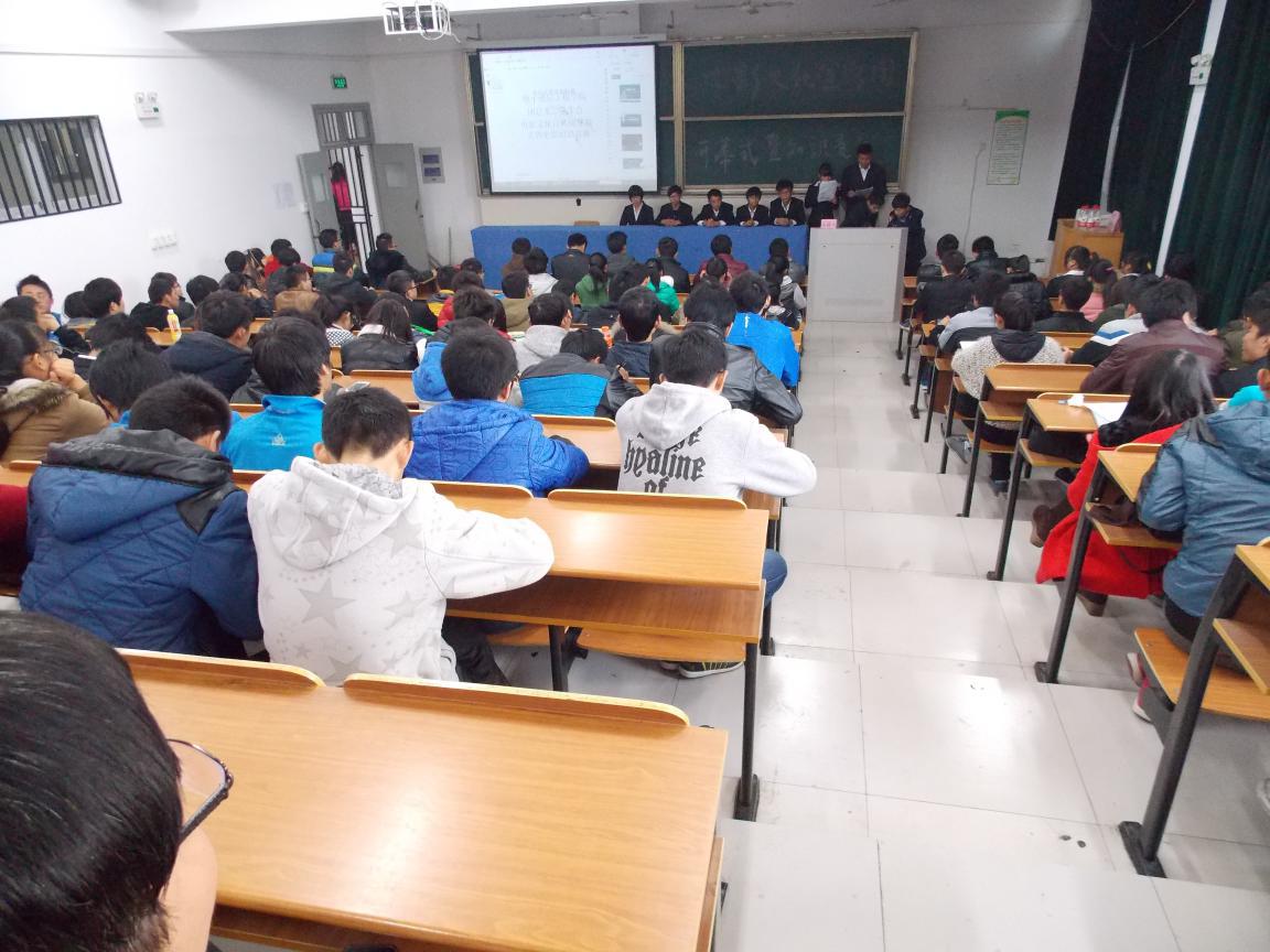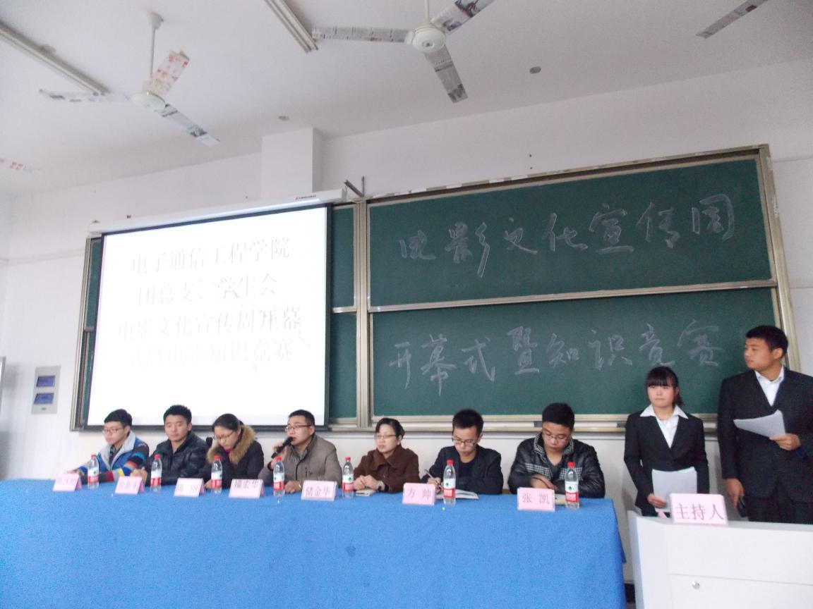 (图文、电院大学生记者团)为了丰富学子们的课外生活,为了让同学们更加深入的融入新华这个大集体,同时也为了让同学们了解更多的电影文化知识,电子通信工程学院于12月4日在12栋教学楼201教室举行电影文化宣传知识竞赛。出席本次的嘉宾有我院行政副院长操宏华、学管秘书兼学生会指导老师陈丽、行政秘书储金华,学生会主席徐新东、团总支副书记方帅、副主席陈庆松、尹成强、张凯、荣飞飞。