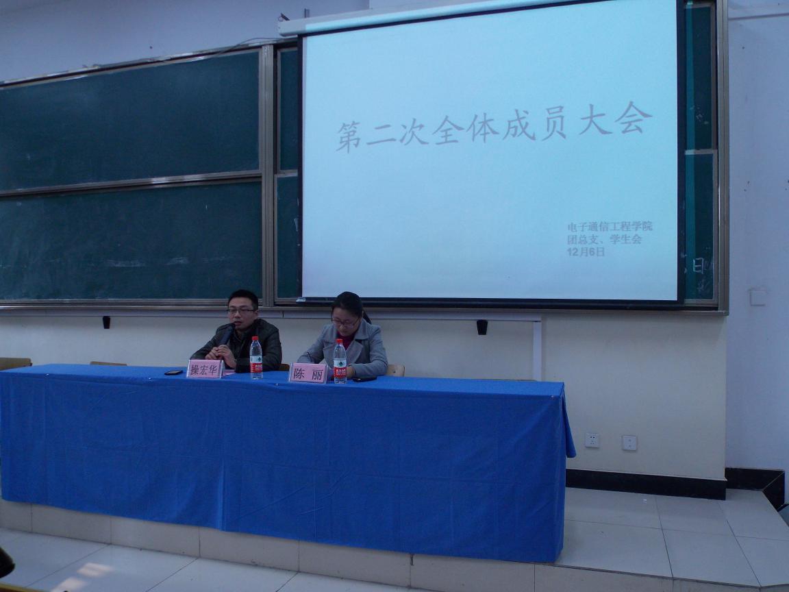 (图文、电院大学生记者团)电子通信工程学院团总支学生会第二次全体成员大会于6日中午在公教102隆重召开。出席本次会议的领导有行政副院长操宏华 ,学管秘书兼学生会指导老师陈丽,学生会主席徐新东、副主席尹成强、陈庆松、张凯、荣飞飞、丁婉茹以及学生会全体部长及大一干事。