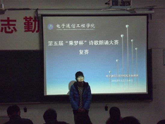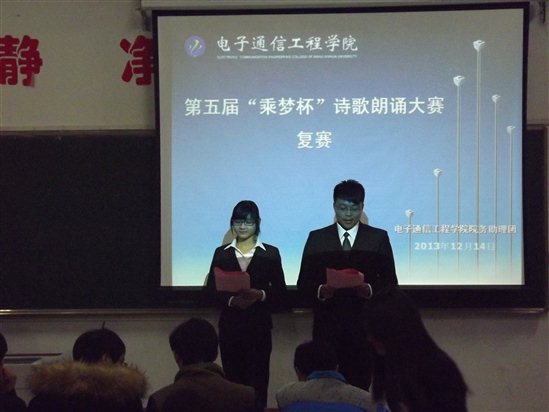为进一步增强广大工科学生写作能力和文学修养,提高电院学子对朗诵的积极性。电子通信工程学院第五届“乘梦杯”诗歌朗诵大赛经过第一轮初赛的筛选,复赛于2013年12月14日18:30分,在教学14号楼一楼多媒体教室拉开帷幕。莅临本次复赛的评委有各二级学院助理团团长及副团长。