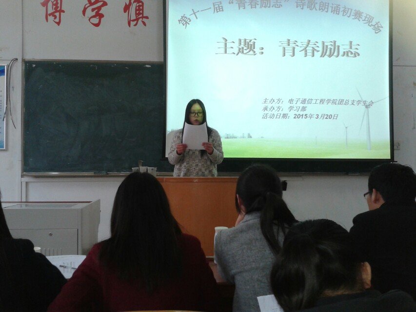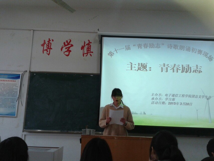 “东方洒雨露,会人天地春。”诗歌的春天也即将在演绎中绽放。为了丰富同学们的课余文化生活,为他们提供一个展现自我的平台,2015年3月20日,电子通信工程学院第十一届以“青春励志”为主题的诗歌朗诵比赛于电院108室正式拉开序幕,电子通信工程学院团总支学生会部长应邀担任此次比赛的评委。
