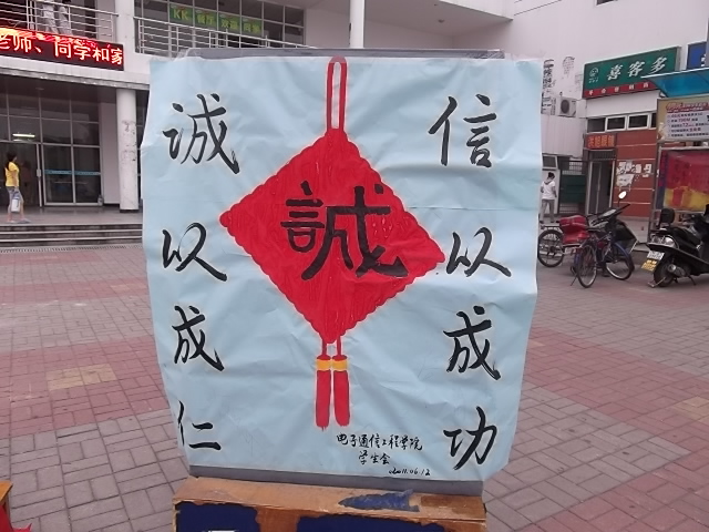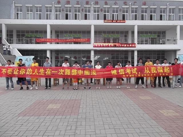 为倡导优良学风和考风,保证期末考试顺利进行,由电子通信工程学院团总支学生会面向全校学生举办的“不要让你的人生在一次舞弊中搁浅--诚信考试,从我做起!”签字活动于2011年06月12日17:20在翰林广场成功开展。