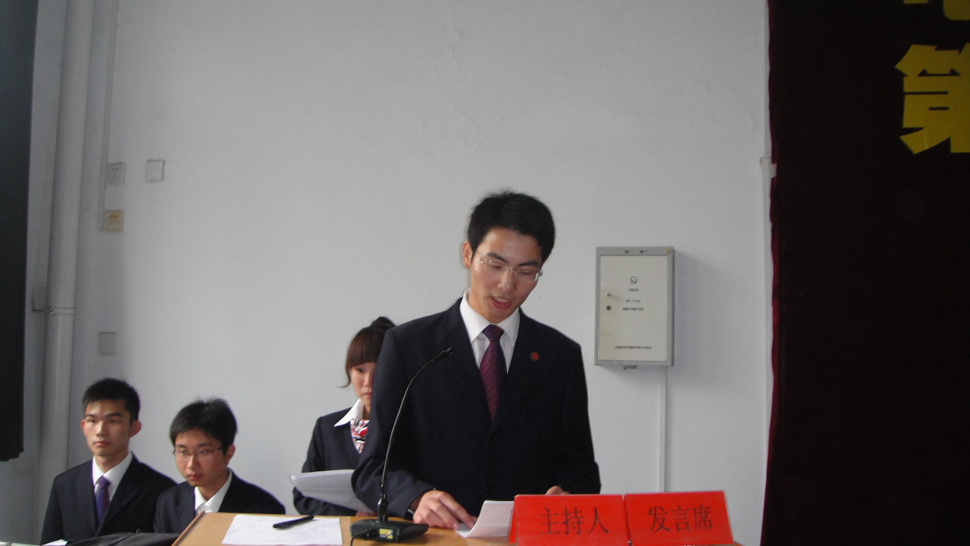 12:20,大会拉开帷幕,首先集体观看电院助理团过去一年总结PPT,场景历历在目,记录下过去一年的汗水与成就。接下来第二届院务助理团团长黄乐对上一年工作做了总结、2010级老队员、2011级新队员分别进行了加入院务助理团的宣誓、对上一届的先进个人及优秀助理进行颁奖。随后,电院院务助理团指导老师项华伟宣布了第三届助理团干部名单并颁发聘书。最后,电院行政副院长操宏华总结了电院院务助理团成立以来对老师们的服务及贡献,并对第二届干部工作表示肯定,对第三届新干部予以期望及对新一届成员表示欢迎。