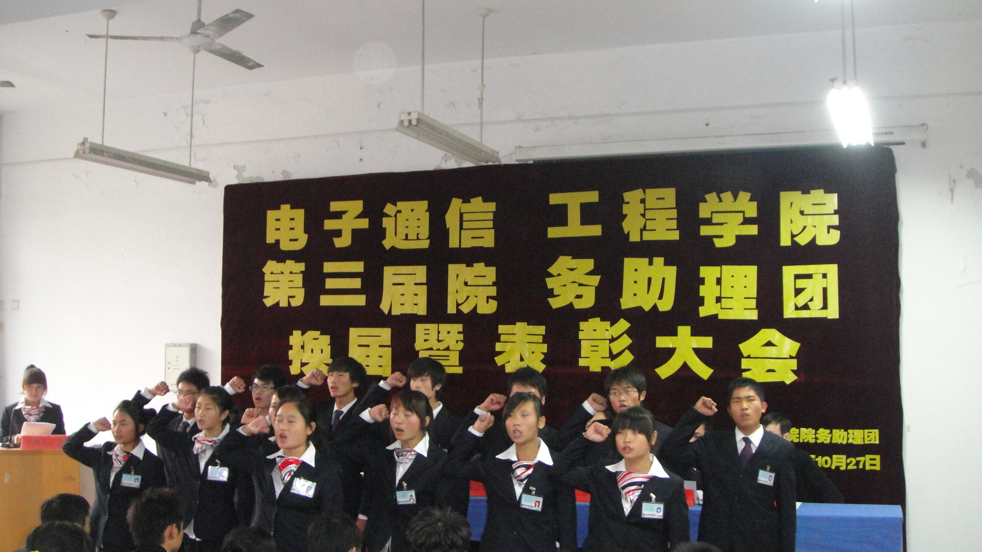 2011年10月27日中午,电子通信工程学院院院务助理团第三届换届暨表彰大会在D316隆重举行。出席本次大会的领导有电院行政副院长操宏华、院长助理石玉、行政秘书储金华、学管秘书及电院助理团指导老师项华伟、实验室主管王志、教务员李文谨,参加此次大会的嘉宾有各二级学院助理团代表、学院各社团代表及电院各班班委。