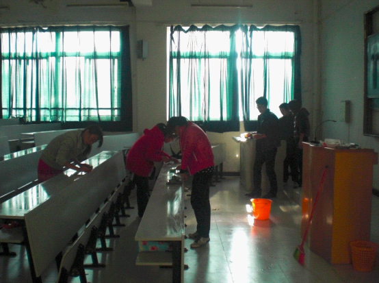 为了让电院的校园更美丽,让同学的上课环境更舒适,我院学生会于2011年11月25日中午12点在电院教学楼组织学生会全体成员开展了一次以“清除课桌垃圾,创建和谐校园”为主题大扫除活动。本次活动的口号是“我是课桌我爱美”,任务是清扫电院公共教室的垃圾、洗净多媒体教室课桌的笔痕、教室里的死角以及刮除电院宣传栏和墙体上的牛皮癣广告。