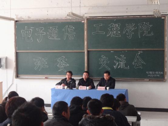 为提高我院学生会工作效率,加强班风学风建设,营造良好的院风、班风和学风。2011年12月16日中午12:20,由我院团总支学生会承办的“电子通信工程学院班委交流会”在D316阶梯教室如期举行。参会人员有电院所有班级班委代笔爱及学生会生活部、纪检部全体成员。与会的领导有电子通信工程学院行政副院长操宏华、代理学管秘书及学生会指导老师张家宝、学生会主席詹刚。本次交流会由詹刚主持。