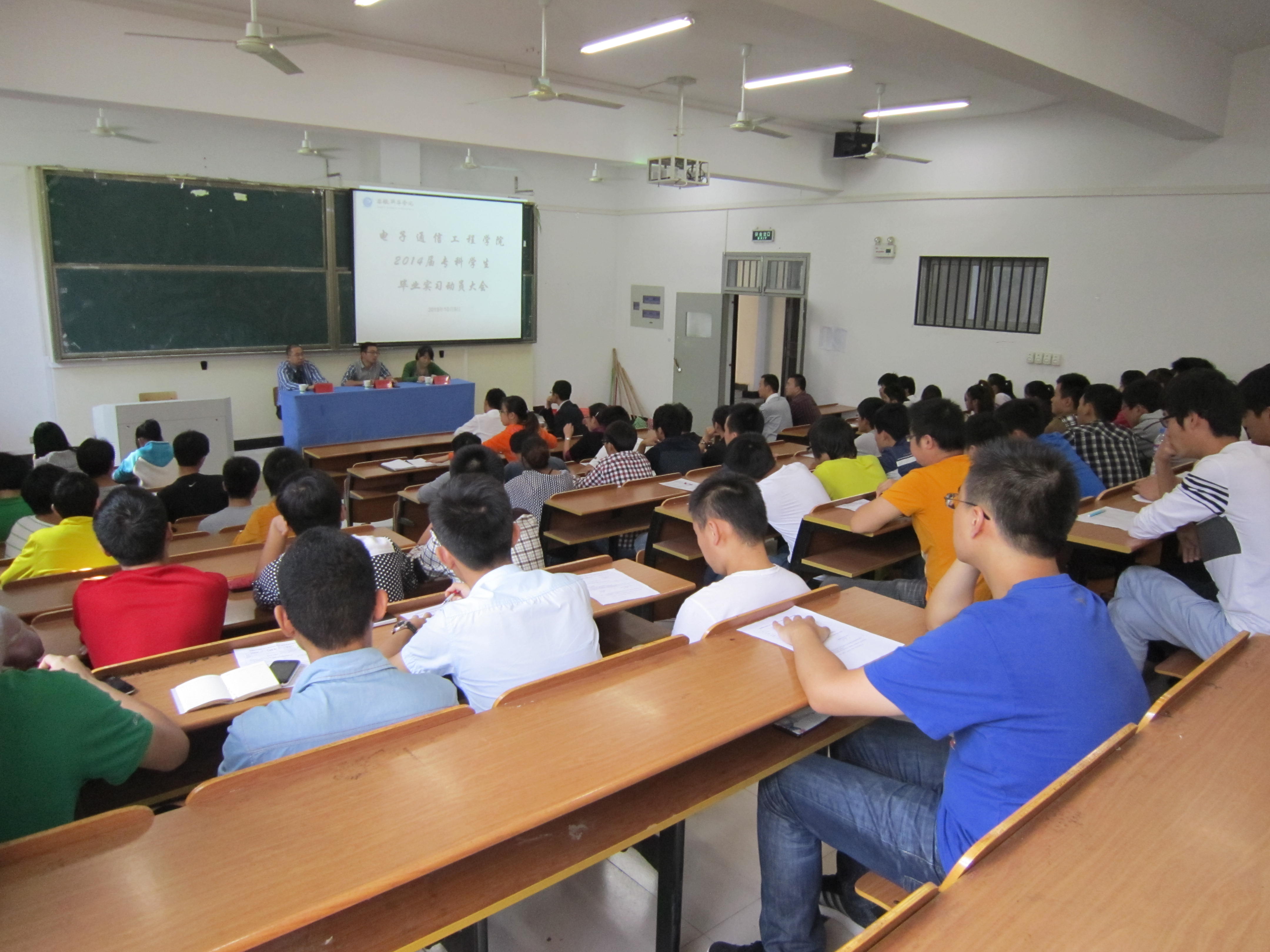 10月9日下午,电子通信工程学院2014届通信技术、应用电子技术专业学生毕业实习动员大会在12号楼102召开,航嘉电器有限公司总经理尹卫星、峻凌电子有限公司人事主管夏冬梅、电子通信工程学院副院长操宏华及行政秘书、教学秘书、辅导员参加了会议。