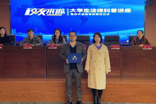本网讯(通讯员:周品)11月26日下午,第十八期“校友来啦”大学生法律科普讲座暨校外实践导师聘任仪式在科研楼二楼多功能厅举行。我校2009届应用电子专业校友、上海协力(合肥)律师事务所合伙人赵超受邀返校,电子工程学院/智能制造学院副院长汪明天、校友工作办公室副主任李燕飞、院长助理姚玲、行政秘书周品及师生代表参加活动,仪式由校友工作办公室主管胡名慧主持。