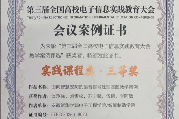 本次大会由教育部高等学校电子信息类专业教学指导委员会与高等学校国家级实验教学示范中心联席会电子学科组主办,湖南省普通本科高校电子信息类专业教学指导委员会承办。于2026年1月9―11日在长沙市成功召开。大会主题为“传播实践教育成果,赋能创新人才培养”,旨在总结全国高校在电子信息教育与教学方面的实践经验,推广优秀成果,吸引全国300余所高校的教师、教育专家及企业代表参与。会同期开展教学案例征集与评选活动。电院高度重视此次评选,积极组织教师团队筹备申报。凭借先进的教学理念、扎实的改革实践以及突出的育人成效,谈玲珑团队设计的教学案例——《面向智慧安防的语音信号处理实践教学案例》荣获三等奖。