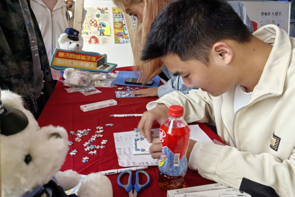 为打破传统宣传教育的枯燥感,学院打破常规,将反诈知识融入趣味互动游戏中。在教学楼的活动现场,学院设置了“反诈大闯关”、“圈住骗局”等特色游戏区域。同学们需要通过识别常见的诈骗话术、回答刷单返利及冒充客服等高频骗局的防范技巧来赢取积分。